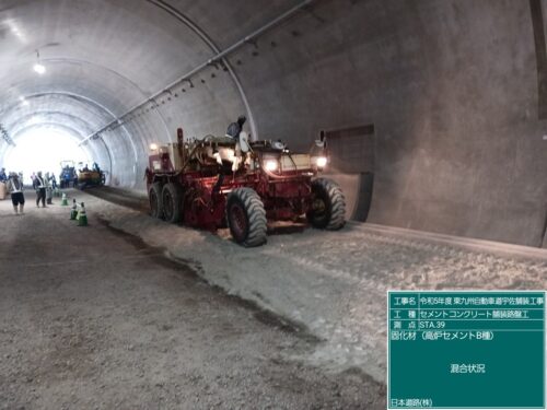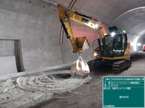 トンネル内が狭いこともあり、壁面・天井・新設側溝等への接触防止の為、材料の受取・散布、