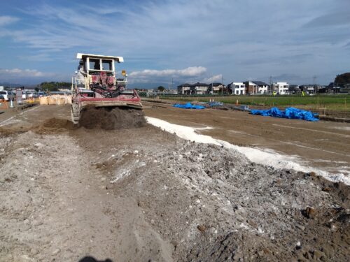 山風が吹きやすい土地で強風が吹く恐れがあったので、一気に固化材を散布せずに